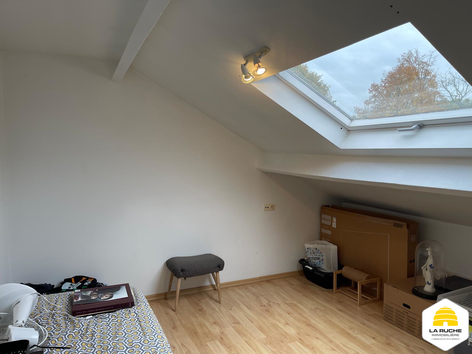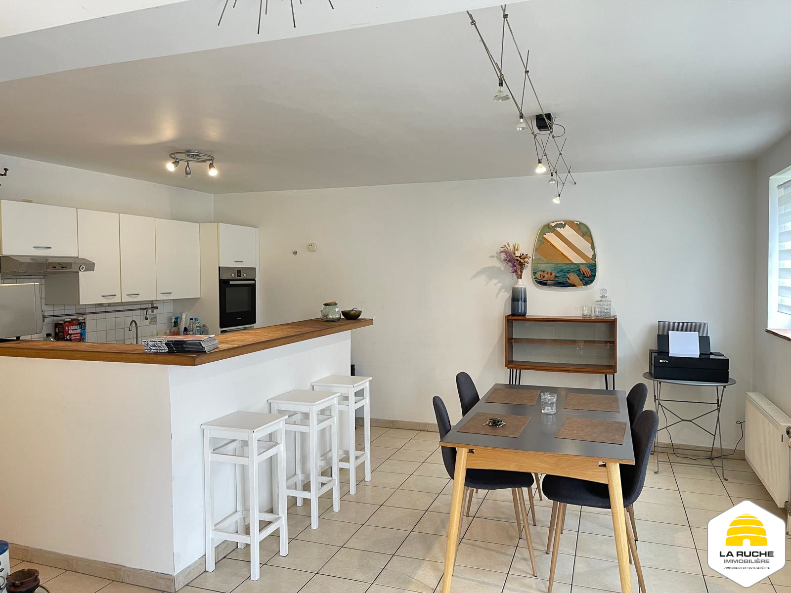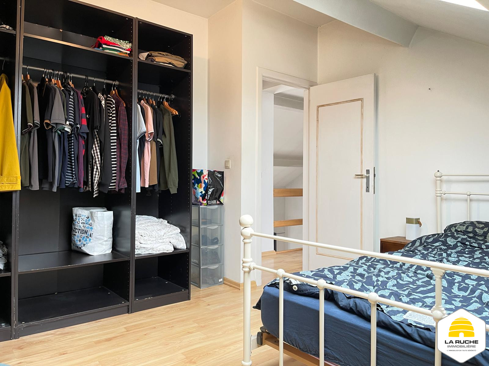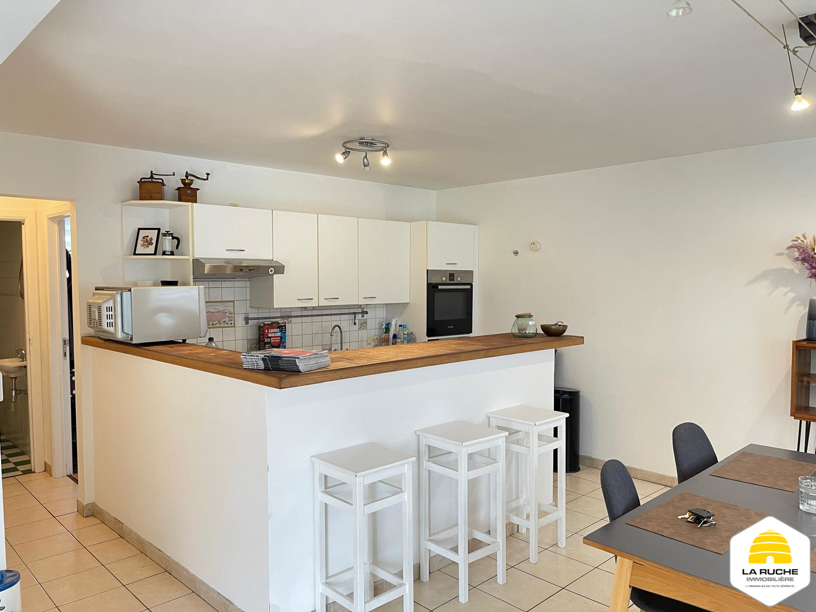 Composition : au premier niveau : séjour (20,7 m²), accès au balcon (5 m²), Salle-à-manger et cuisine équipée ouverte (19 m²/ équipements : taques au gaz, hotte, four, frigo, lave-vaisselle), WC individuel (1,2m²), chambre/bureau (8,7m²),