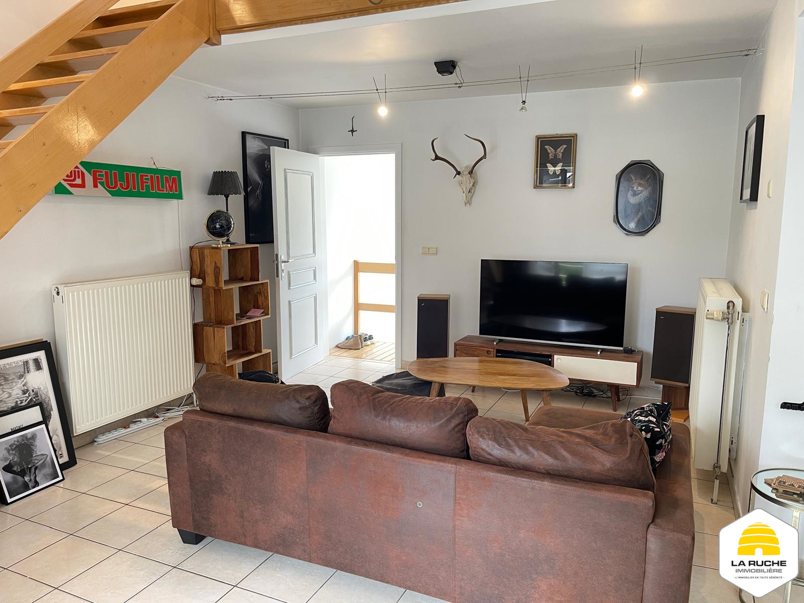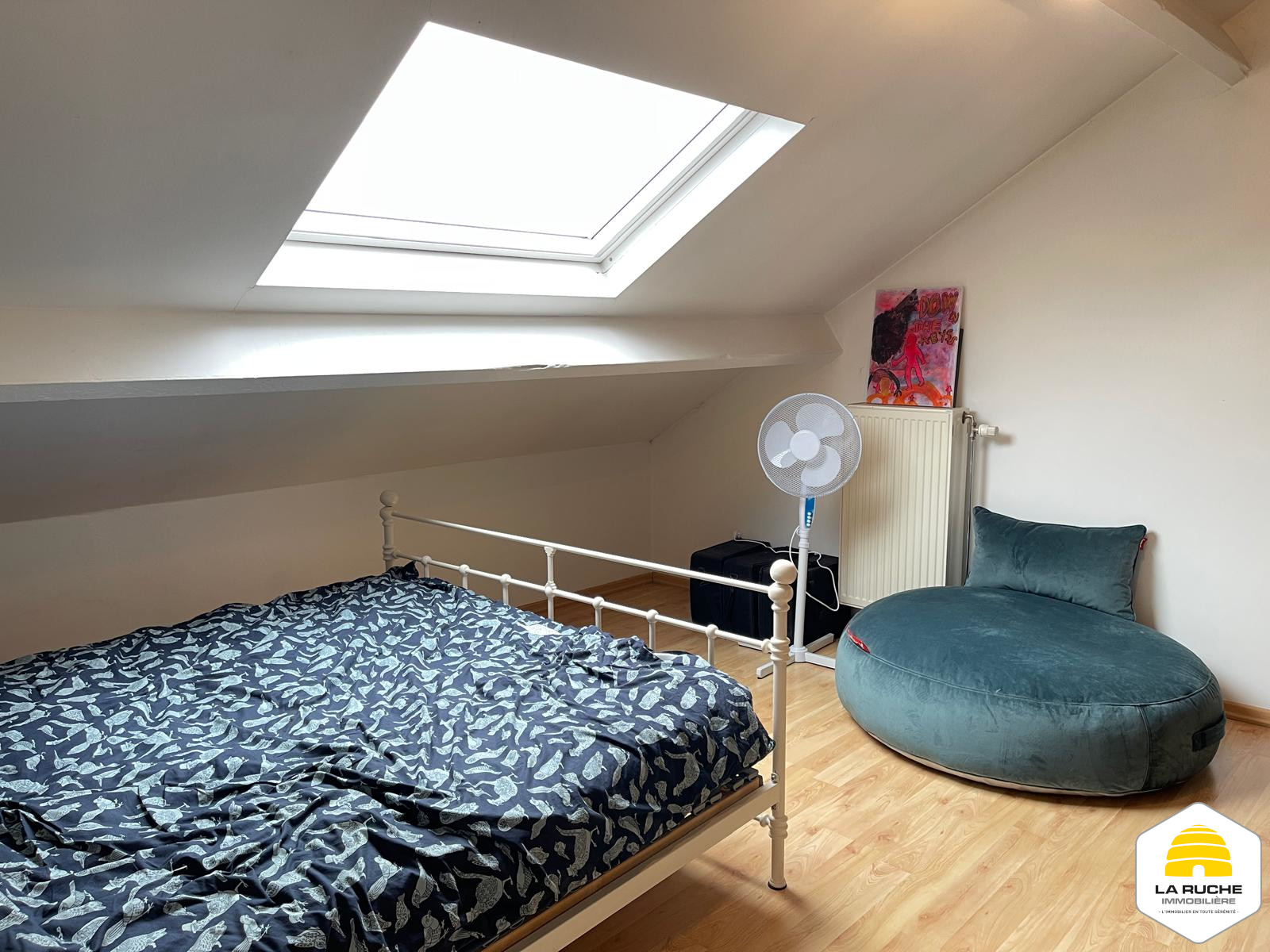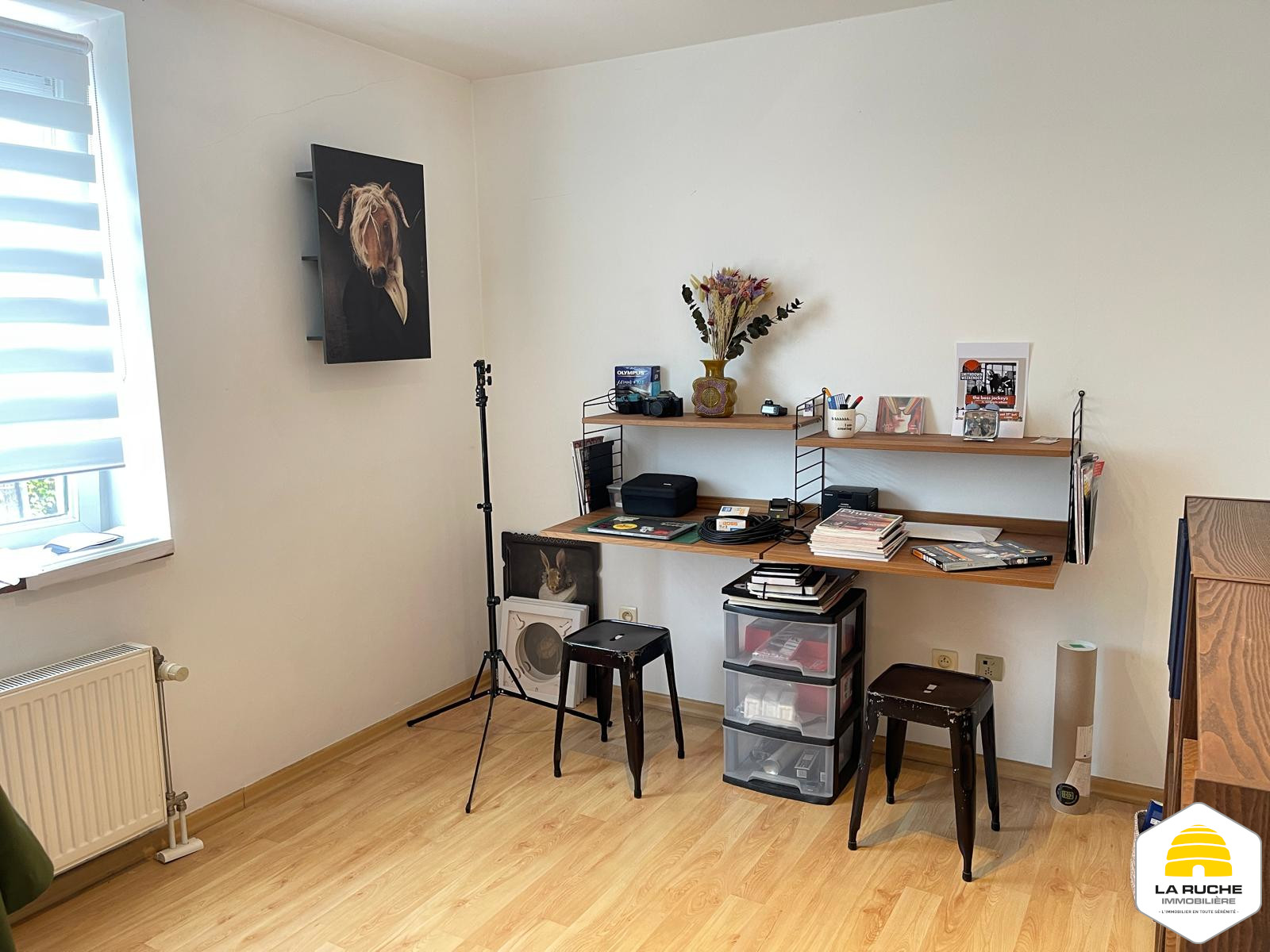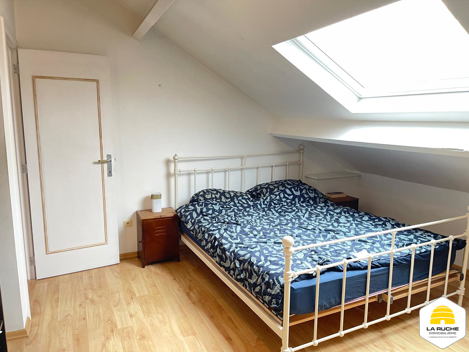 Composition : au premier niveau : séjour (20,7 m²), accès au balcon (5 m²), Salle-à-manger et cuisine équipée ouverte (19 m²/ équipements : taques au gaz, hotte, four, frigo, lave-vaisselle), WC individuel (1,2m²), chambre/bureau (8,7m²),