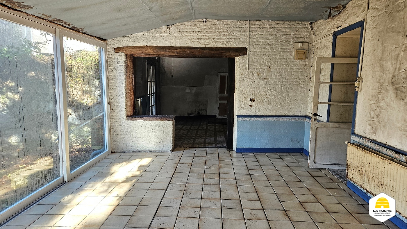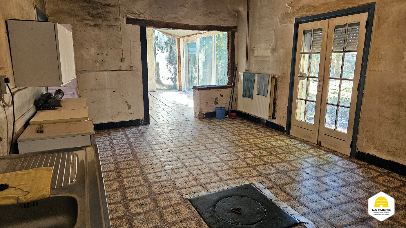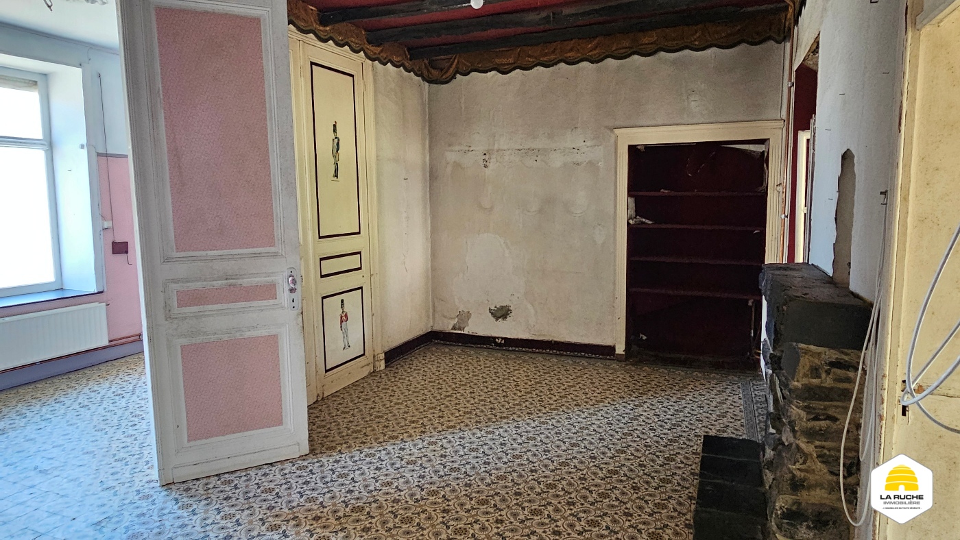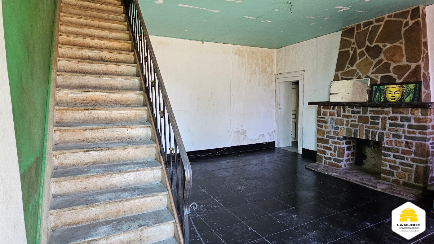 Au rez: vaste espace salon sur pierres bleues (31m²), salle-à-manger sur carreaux de ciment fleuris (31m²), espace cuisine (22m²-aucun équipement), SDB (10m²/état brut), véranda (24m²), étable en façade avant ( 40m²), accès jardin