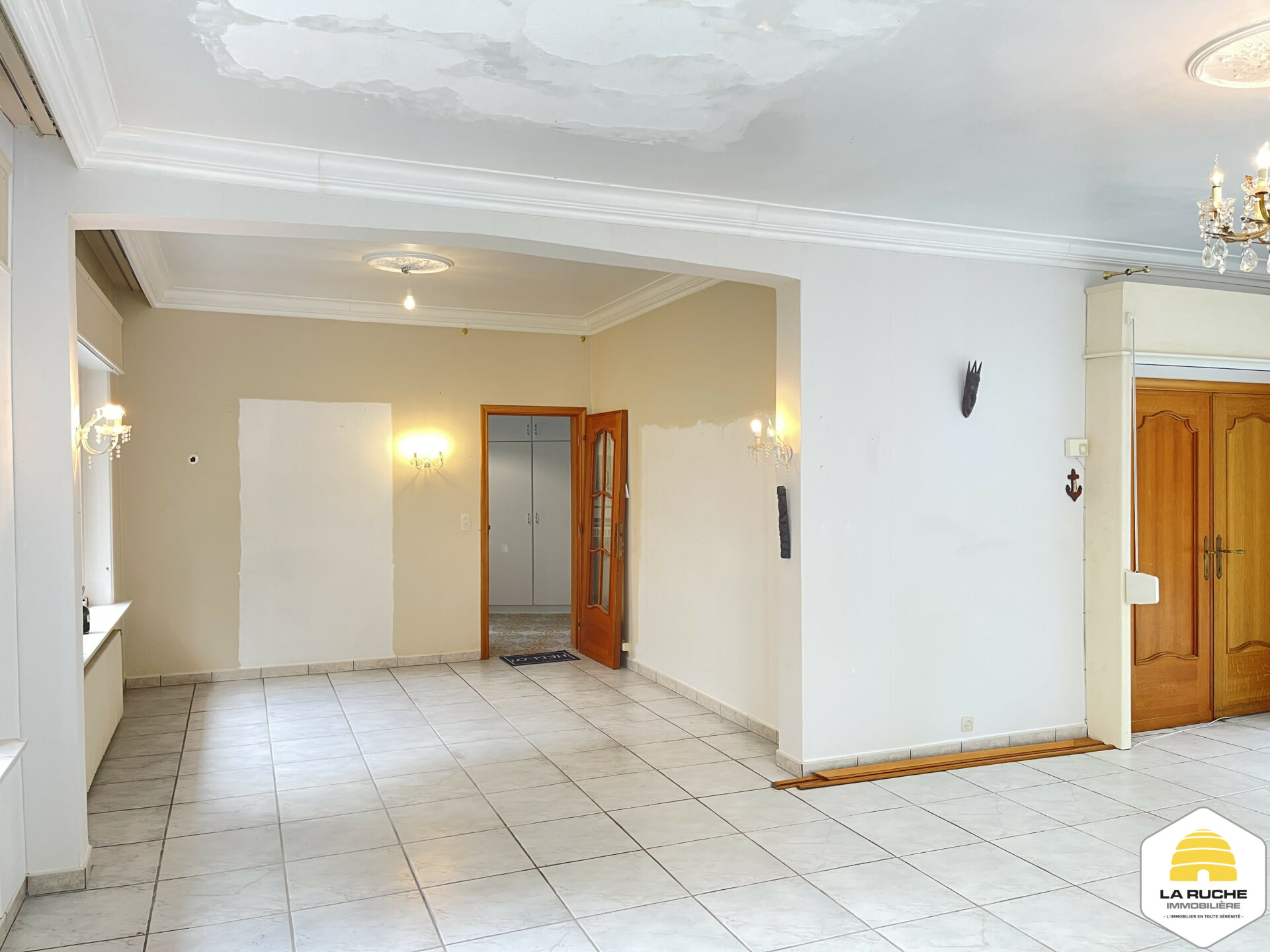 Spacieuse et lumineuse villa de 175m² nets habitables et située sur une propriété de 26a et 67ca, composée de plusieurs niveaux, offrant de beaux volumes et des matériaux de qualité : hall d’entrée en marbre, séjour lumineux, 1 chambre au rez, salle de bains, grenier aménageable et caves. Châssis en bois double vitrage des années 80, volets électriques, terrasse en bois, électricité conforme jusqu’en 2036. Etage actuellement loué 458 euros.