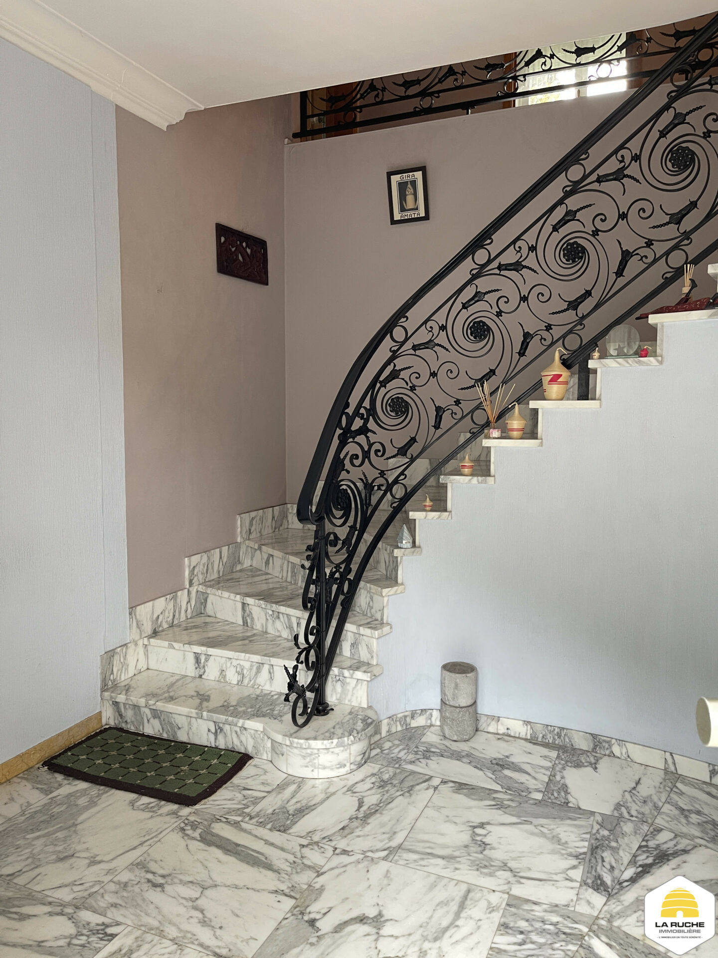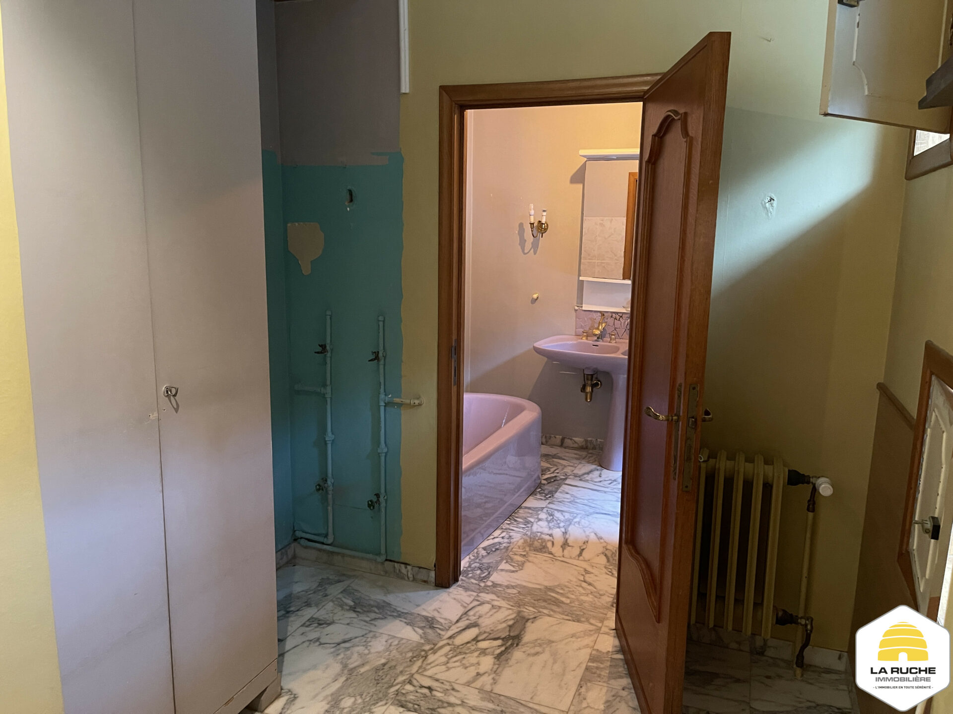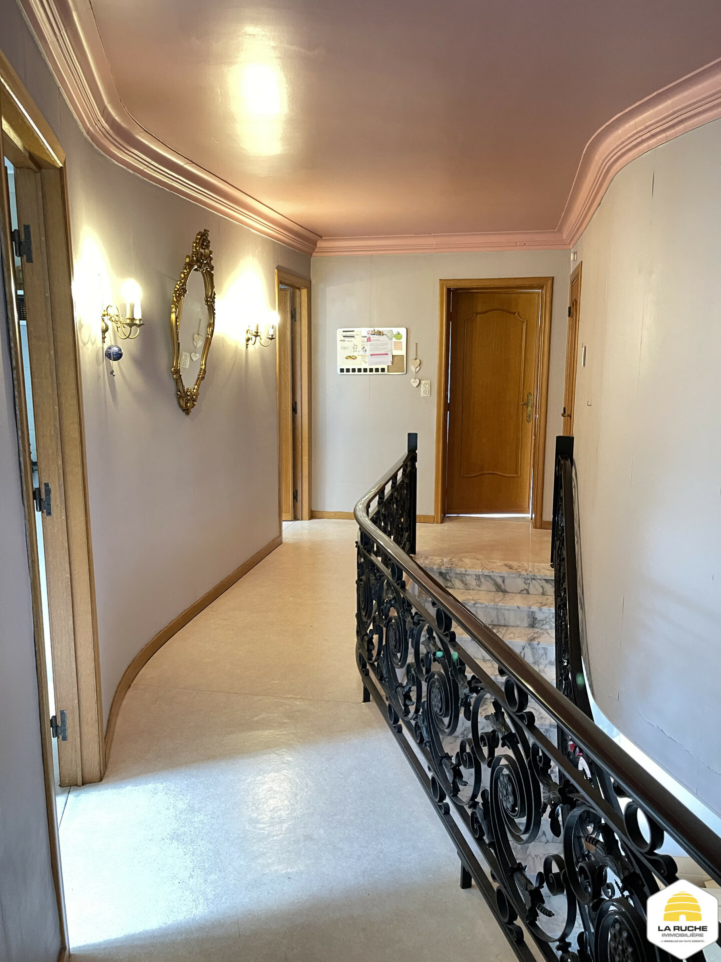 Au 1er étage (via escalier en marbre blanc) : hall (7m² / hauteur sous plafond de 240cm), salle de bains (7m² / châssis en bois double vitrage), trois chambres (21,08m²/18,4m²/8,75m²), WC (1,48m²/WC classique + lave-mains).