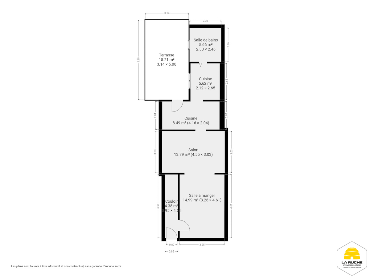 Au rez-de-chaussée : couloir (4,38 m²), cuisine (8,49 m² et 5,62 m²), salle de bains (5,66 m²), salle à manger (14,99 m²), salon (13,79 m²).