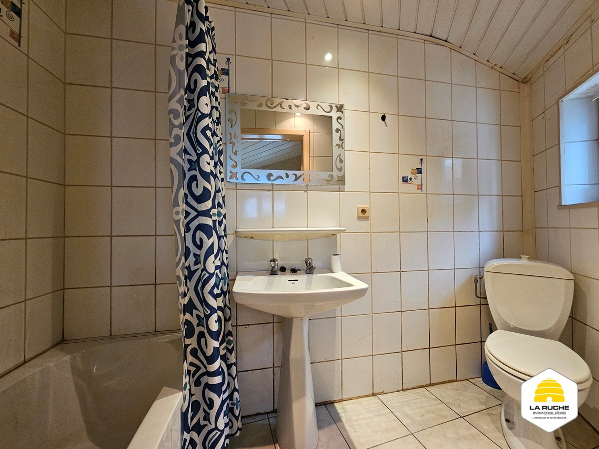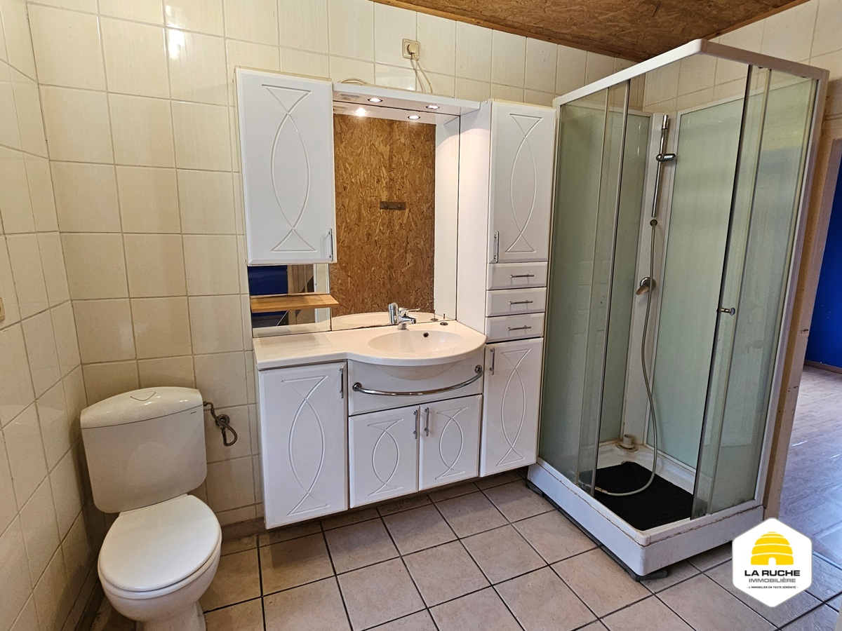 A l’étage: palier (1m²), SDD (5,5m²/cabine douche, WC, meuble simple évier), chambre (9,7m²), bureau (8,5m²) avec une chambre (13,2m²).