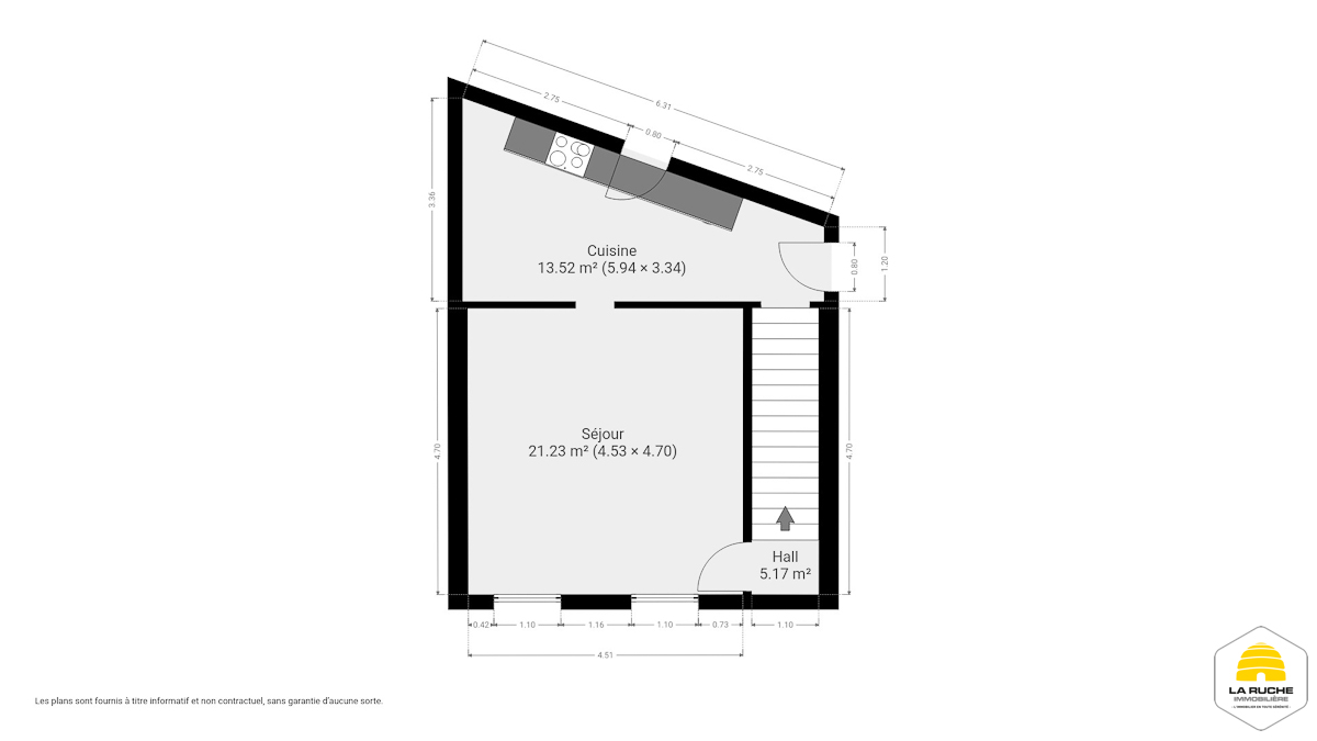 Au rez-de-chaussée : séjour (21,23 m²), cuisine équipée (13,52 m²), hall d’entrée (5,17 m²).